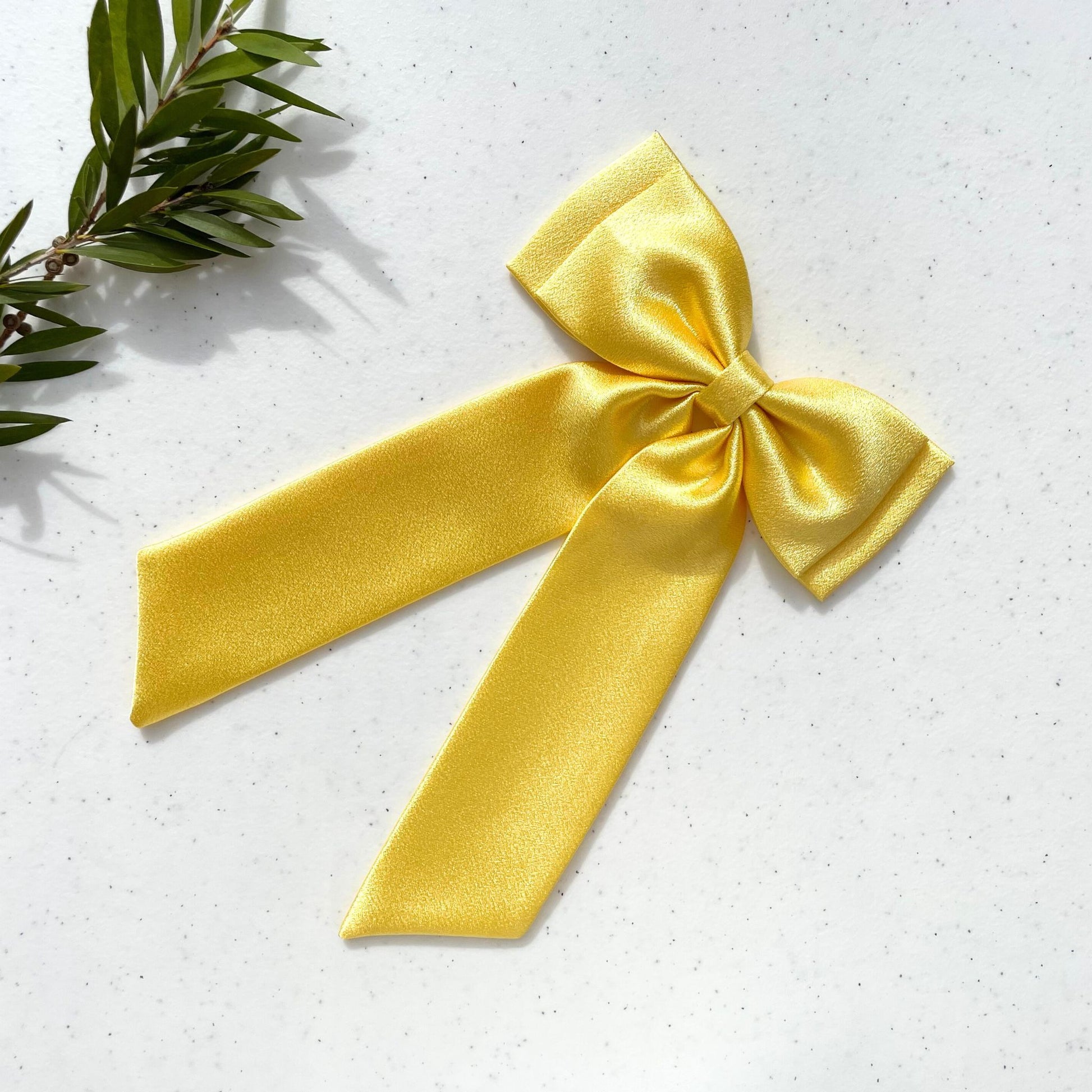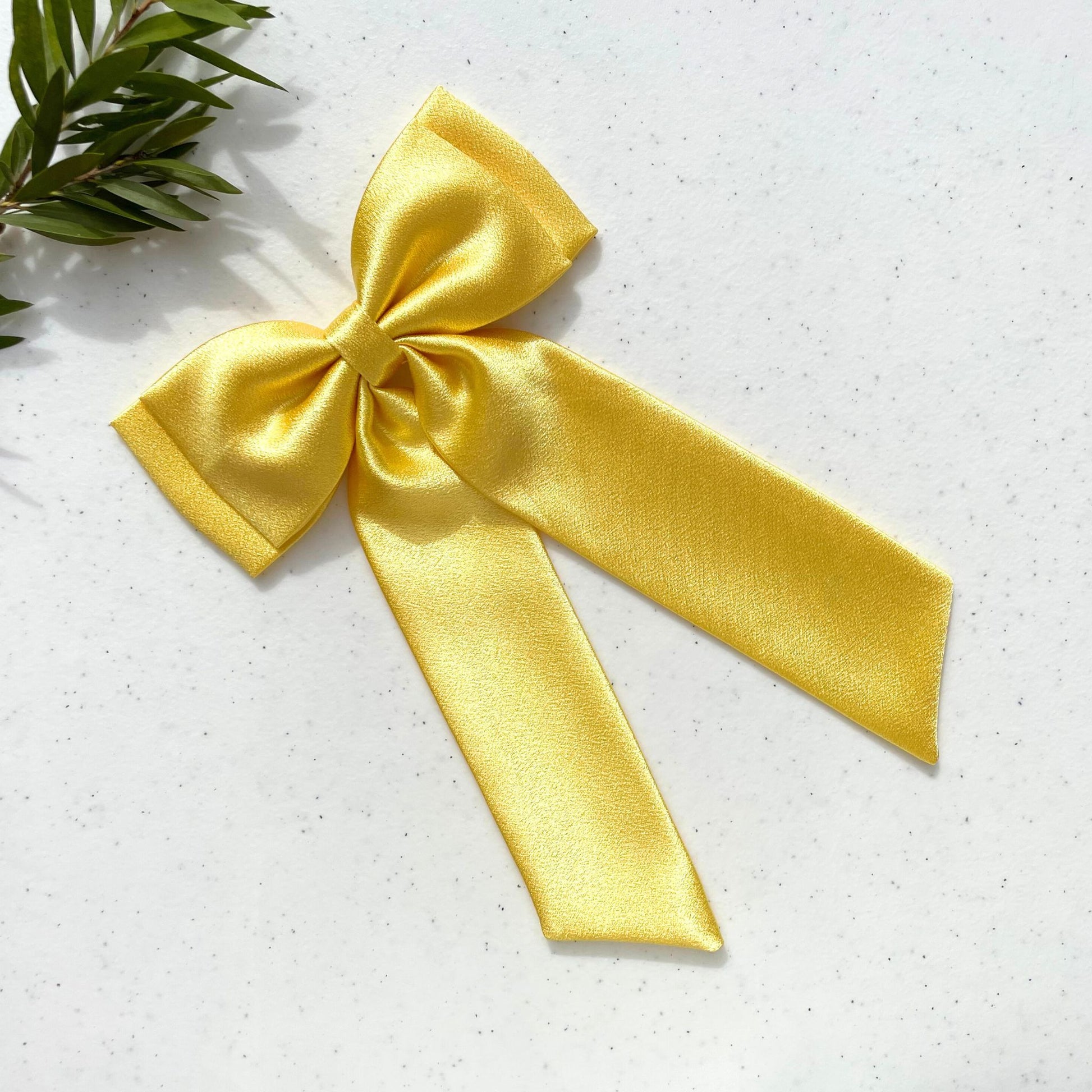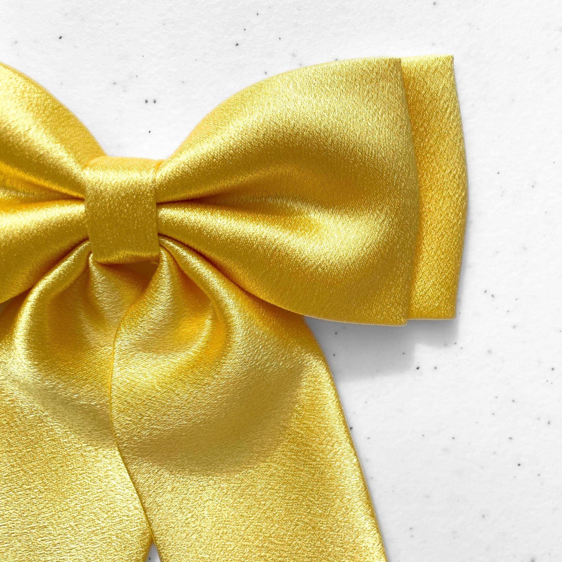 A luxurious, double layer hairbow made with premium satin. Its long tail adds an elegant touch to any outfit, while its bright yellow color makes a bold statement. Handmade with care, this hairbow is the perfect accessory for those seeking a sophisticated and exclusive look.