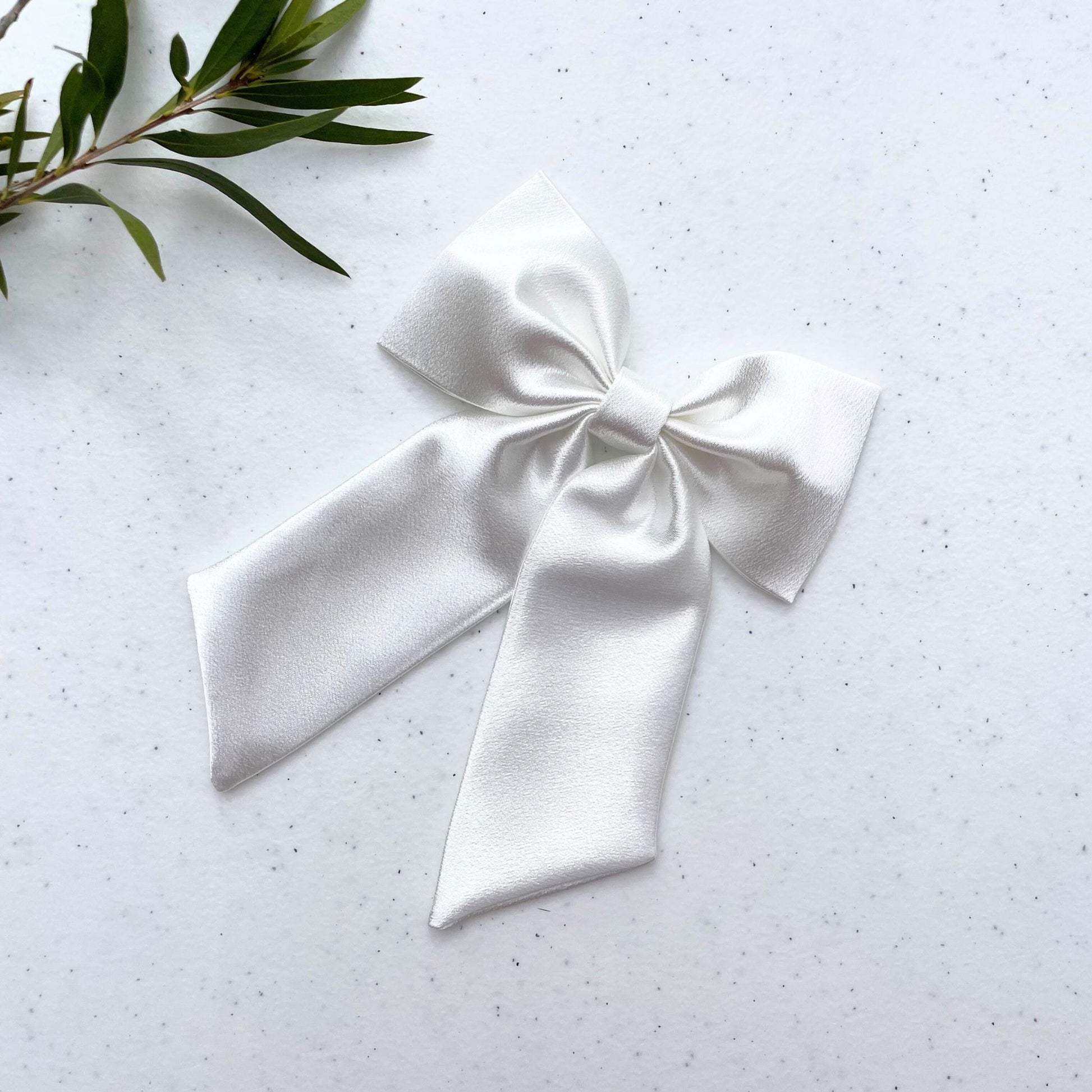 Handcrafted from premium satin, this hairbow is the epitome of luxury. The perfect finishing touch for brides and weddings, the classic style and soft white color add a touch of sophistication to any look. Complete your ensemble with this timeless accessory.