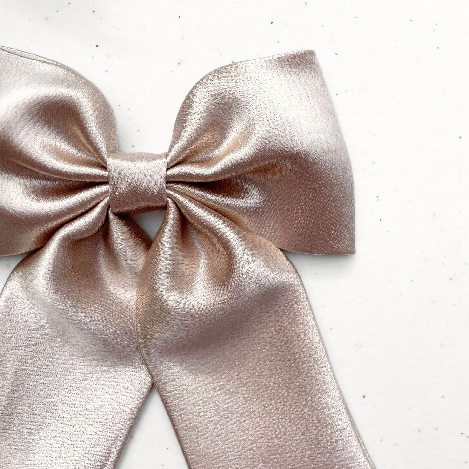 Our luxurious hairbow, crafted from premium satin in a sophisticated champagne beige, features a classic design with a delicate tail. Each one is carefully handmade for a truly exclusive touch. Elevate any outfit with this elegant accessory.