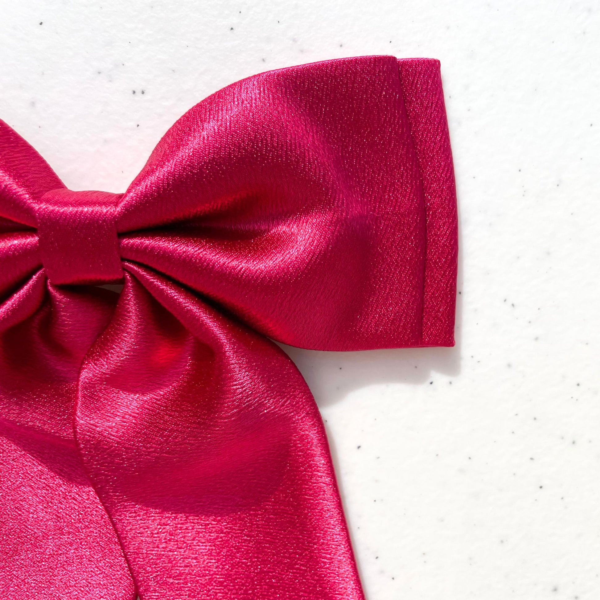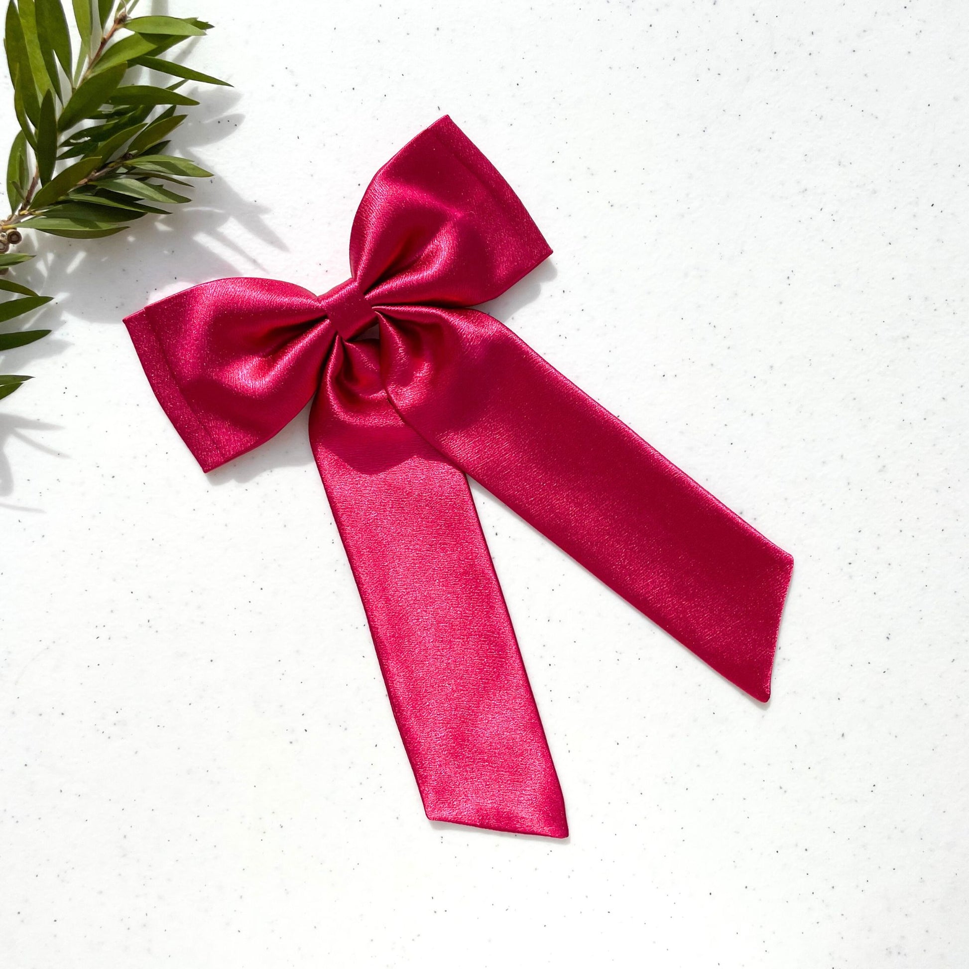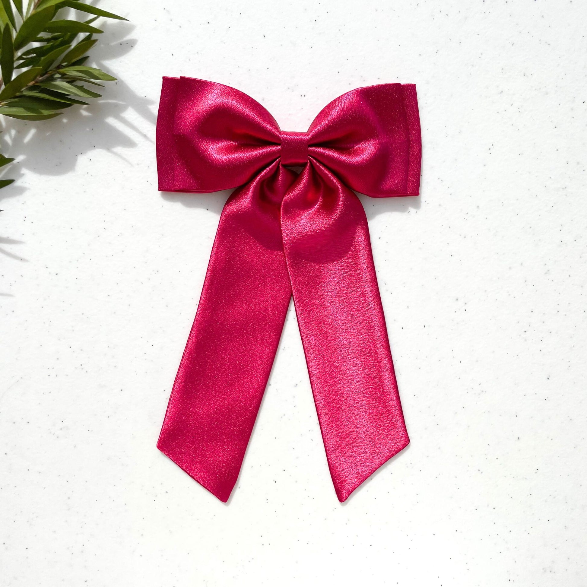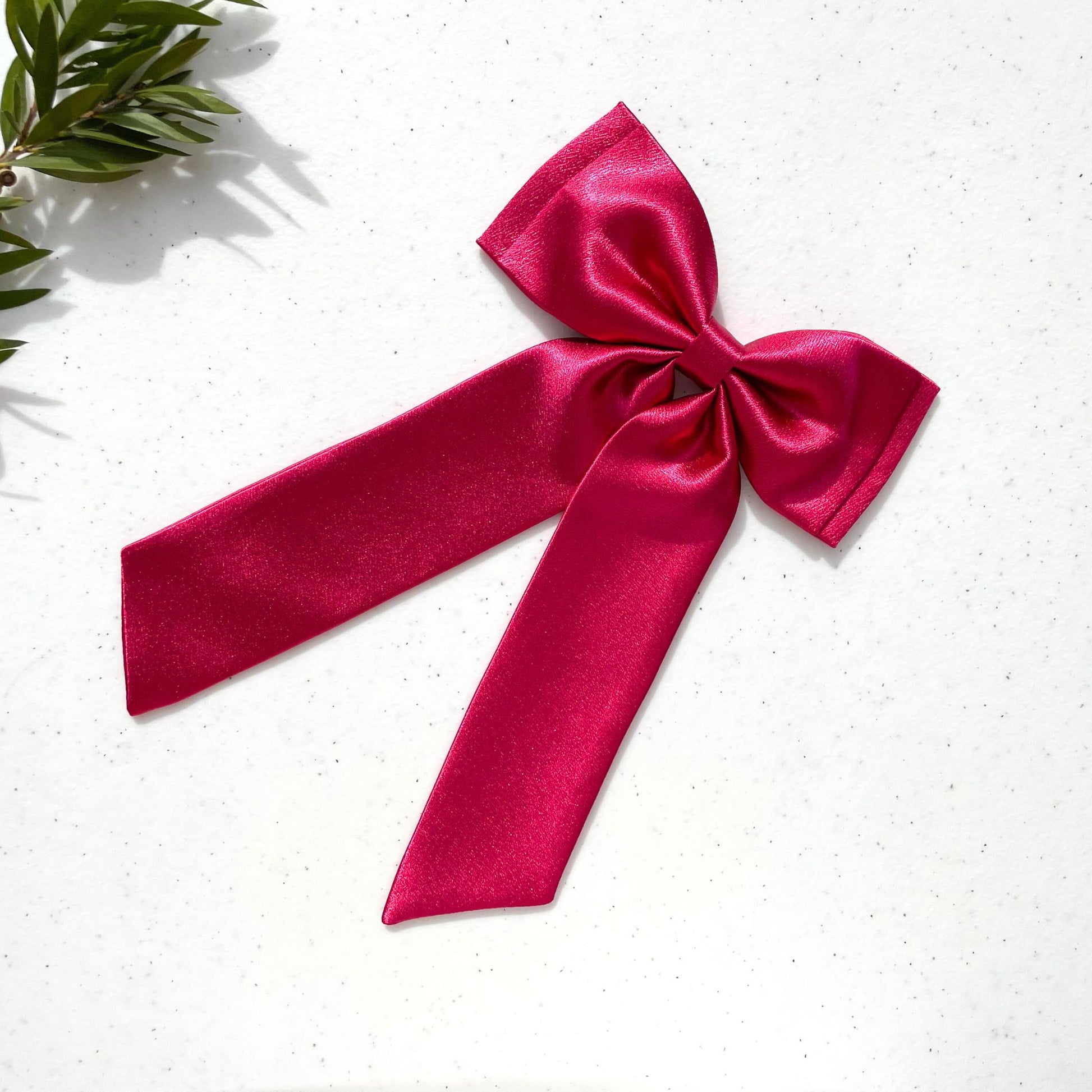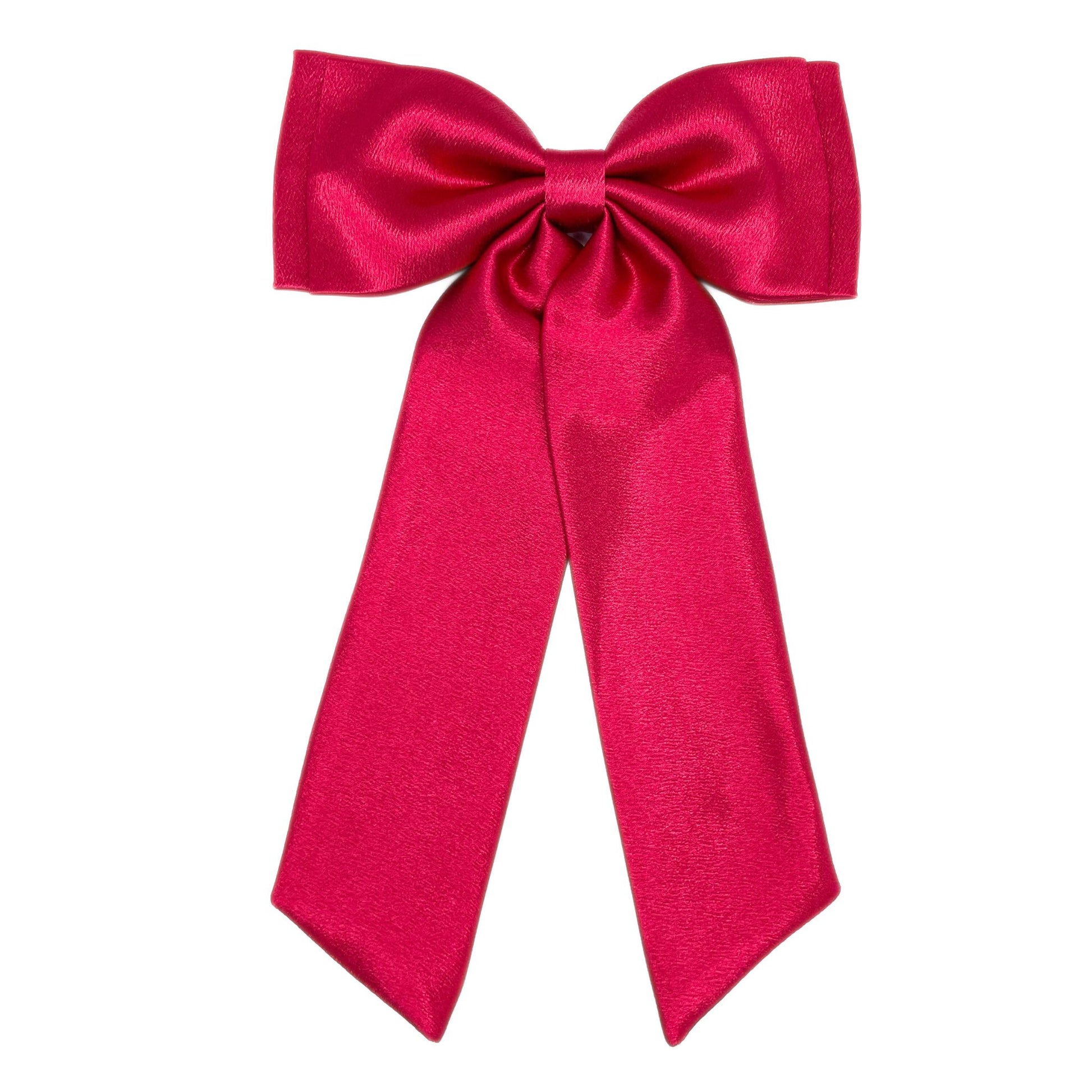 Made with premium satin and handcrafted to perfection, this hot pink hairbow features a slim double layer design and a long tail. Elevate your look with a touch of elegance and sophistication.